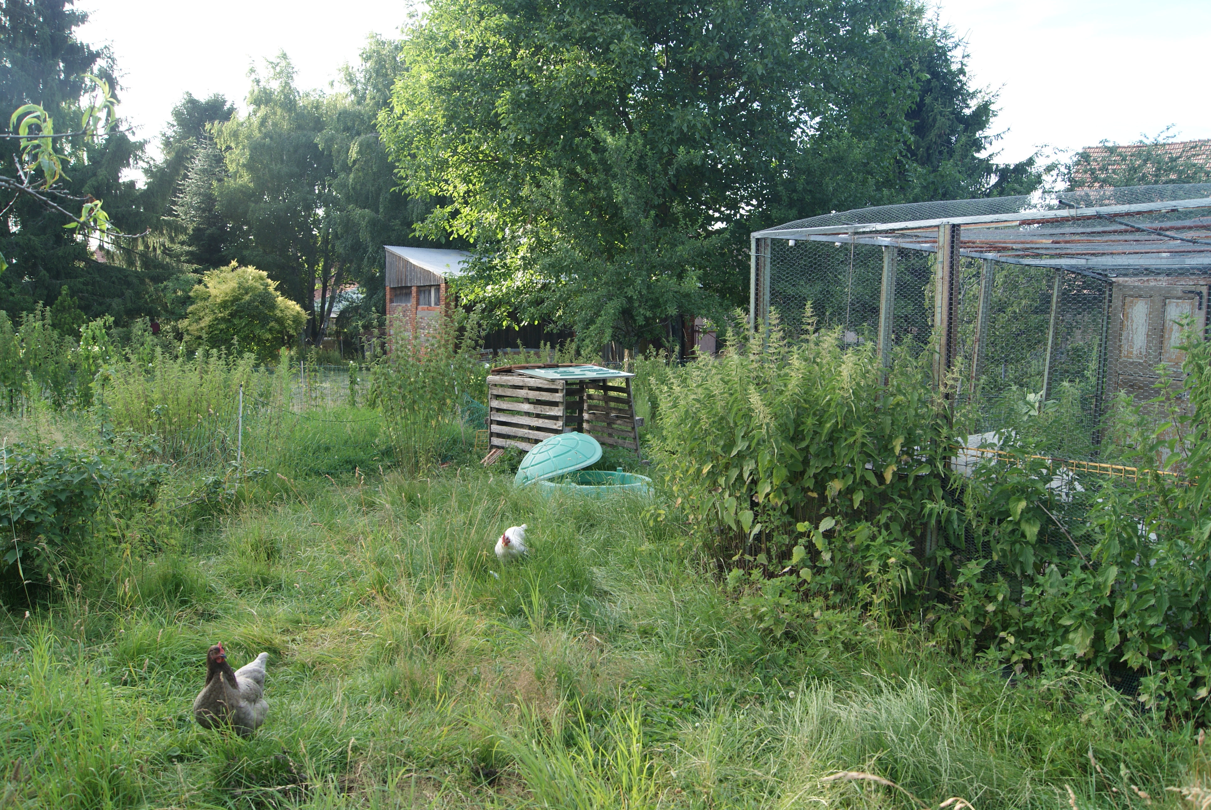 Par manque de temps, nous n’avons pour l’instant fait quasiment aucune modification: j’ai simplement planté trois noisetiers et des pieds de rhubarbe pour leur faire un peu plus d’ombre à l’avenir; nous leur avons également construit une cabane de fortune en palettes à l’extérieur pour qu’elles puissent s’y réfugier lorsqu’il pleut ou qu’il fait trop chaud en journée et nous leur avons rempli un petit bassin (le genre bac à sable ou pataugeoire pour enfants) pour qu’elles puissent y boire, profiter un peu de l’humidité et enfin pour que cela attire des insectes dont elles font leur repas ensuite (la poule est sans merci envers l’insecte venu s’abreuver …). A l’avenir, puisque je souhaiterais accueillir quelques poulettes en plus – je dois admettre qu’elles me ravissent beaucoup- je souhaite continuer à planter de nombreux arbres et leur agrandir le parcours.