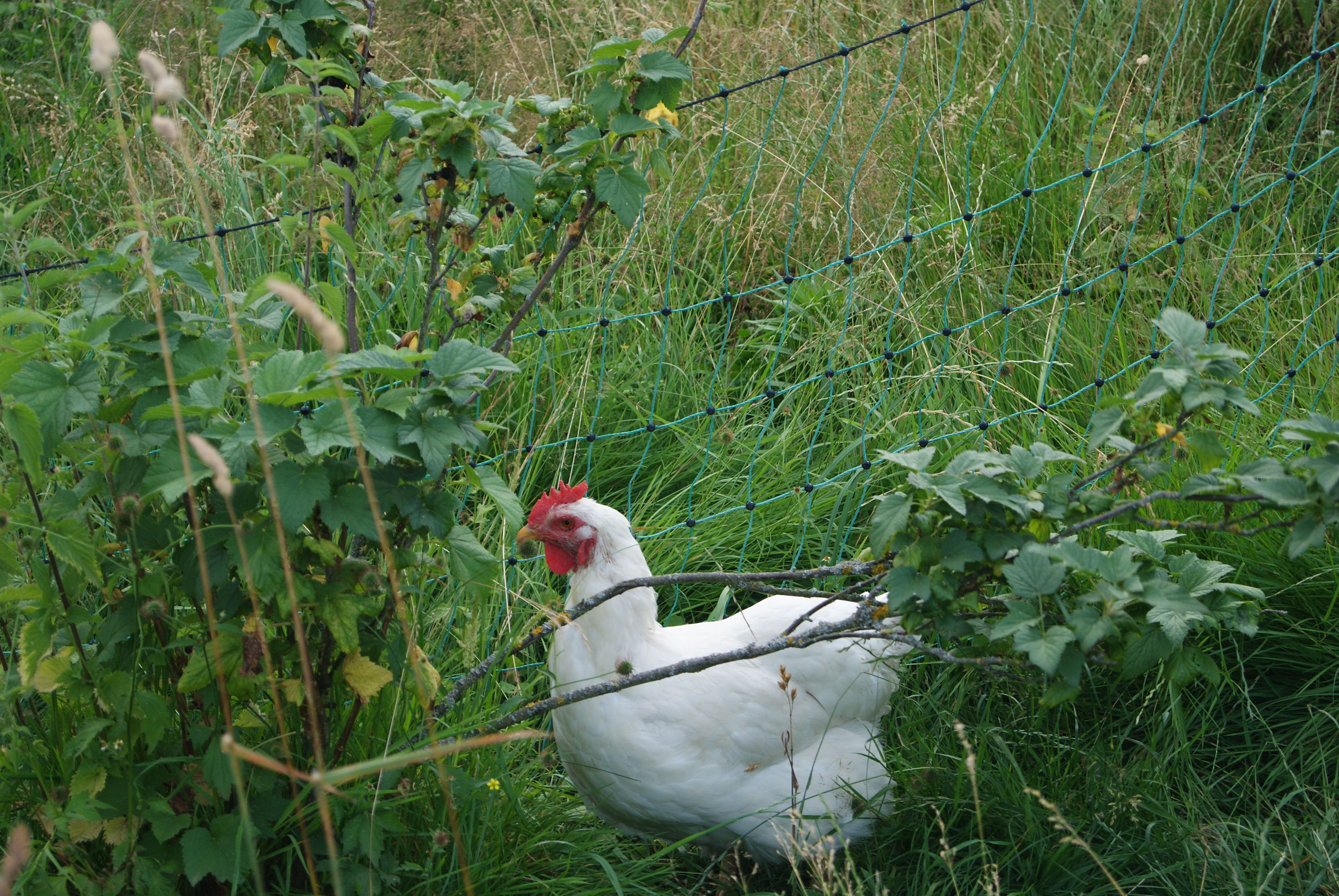 Il se compose d’un enclos entièrement clôturé (y compris en haut et au dessus du toit) avec les dortoirs des poules, afin de les préserver la nuit des prédateurs (qui du coup se rabattent sur le potager et les fruits rouges du terrain, à commencer par les groseilles, framboises, et fraises). En journée, elles disposent d’un parcours enherbé avec deux trois petits arbustes.