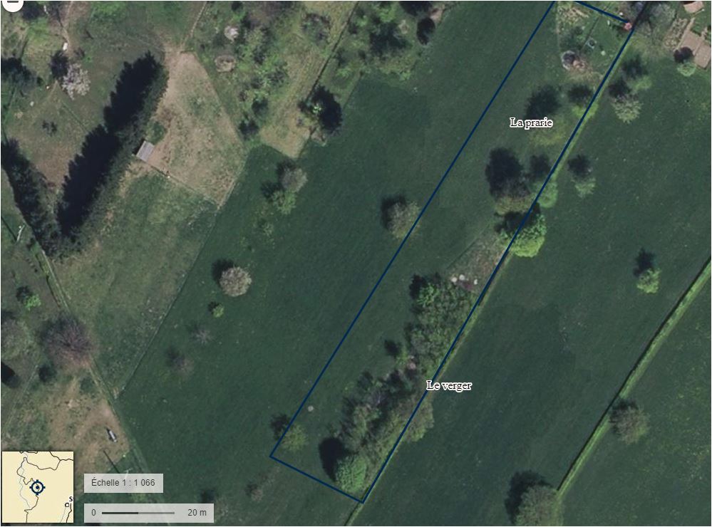 La première chose qui saute aux yeux depuis cette vue aérienne, c’est le fait que terrain de la future micro-ferme est tout en longueur : il mesure 4500 m², et toutefois n’est pas très large. Il est exposé Sud-Nord, et dispose d’un bon ensoleillement (enfin, c’est relatif puisqu’on est en Moselle, mais c’est toujours mieux que plein nord en creux de vallée…).